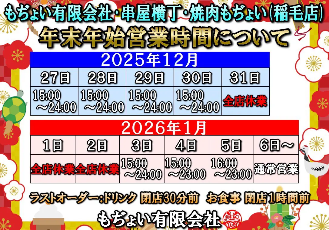 いつも「焼肉とホルモン居酒屋もぢょい。JR稲毛駅西口店」をご利用いただきまして誠にありがとうございます。