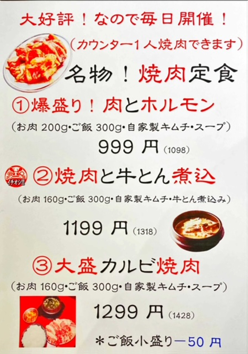 焼肉とホルモン居酒屋 もぢょい。蘇我店 ホーム ご挨拶 公式アプリ こだわり 家族特典 ご宴会コース メニュー 定食 お料理 お飲み物 ご宴会 席情報 店舗情報 採用情報 予約する 焼肉とホルモン居酒屋 もぢょい。蘇我店 ホーム ご挨拶 公式アプリ こだわり 家族特典 ご宴会コース メニュー 定食 お料理 お飲み物 ご宴会 席情報 店舗情報 採用情報 予約する ホーム > 投稿一覧 > お知らせ > 【毎日開催】「焼肉定食」スタートします! 【毎日開催】「焼肉定食」スタートします! 2021.06.04 いつも「焼肉とホルモン居酒屋 もぢょい。蘇我店」にご来店いただき、ありがとうございます! この度、土日祝限定で焼肉定食をスタートすることになりました!! ※6/20(日)までは毎日開催いたします!!! ※期間延長!しばらくの間、毎日開催いたします!!! めちゃくちゃボリューム感ある定食なので、ぜひお腹を空かせてご来店ください。 皆さまのご来店心よりお待ちしております。 ニュース 2026.02.06 【2/7・15】JEFフェア開催のお知らせ! 2026.01.30 【2/9】「肉の日」開催! 2026.01.29 【2/19】「ドリンクの日」開催! 2026.01.20 【1/29】「肉の日」開催! 2025.12.19 【12/24・25限定】もぢょいのクリスマスイベント開催 カテゴリー お知らせ 050-5851-0820 top▲